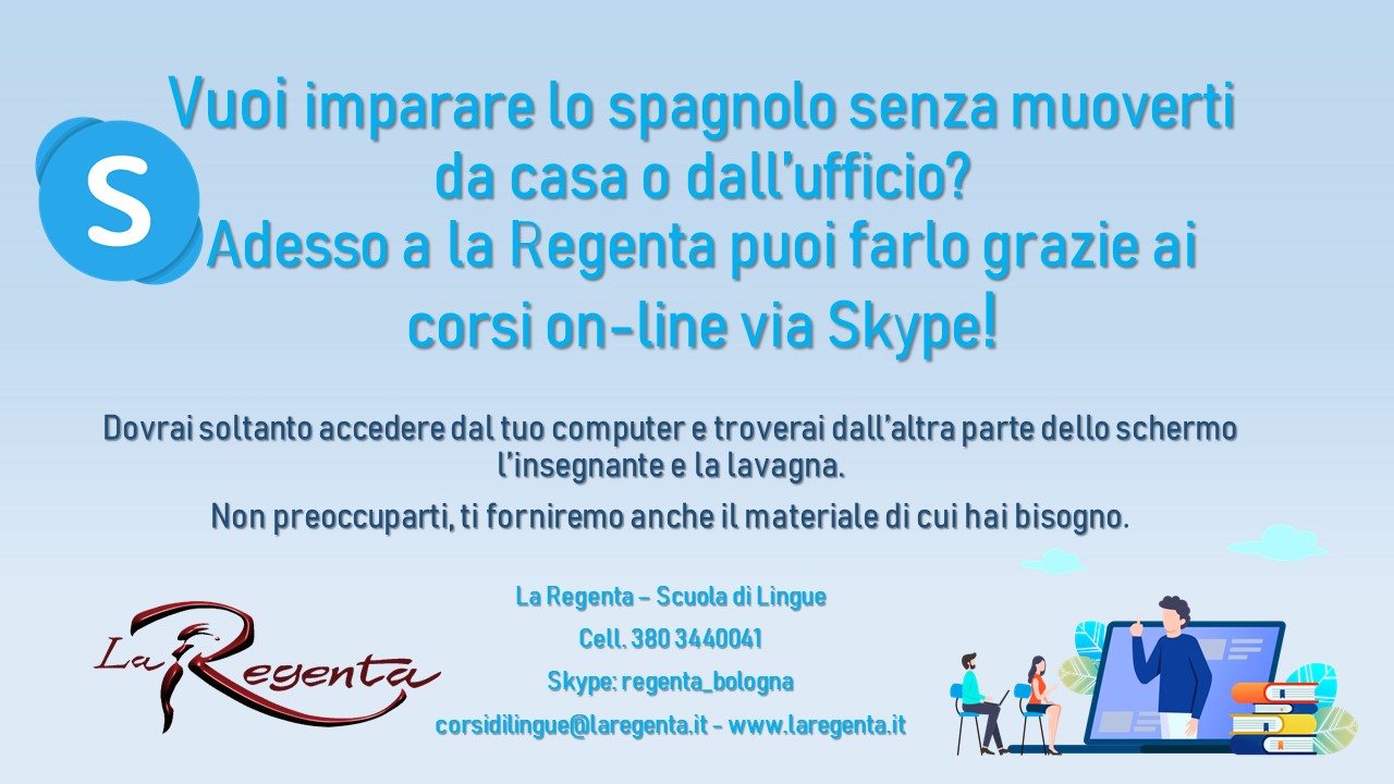 La Regenta è diventata in modo permanente una scuola on-line. Non stai a Bologna, o non puoi muoverti da casa o dall'ufficio? Non c'è problema, potrai fare lezione come se fossi qui da noi, con insegnante, lavagna, e la possbilità di inviare materiale didattico in tempo reale.
